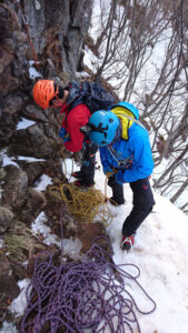 岩入門とは、岩登りの基礎を学ぶ入門です。4月10日のエルプラザでの例会で机上学習会を行い、実技は小樽赤岩で行いました。