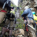 F3も滑る!No1Johnnyが右岸を巻いている間にNo2まっさんが直登開始。まっさんの突破で全員滝登り。