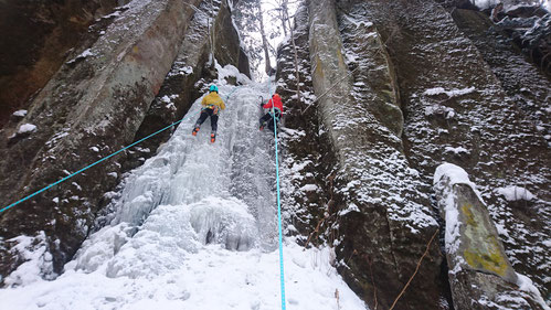 1/9(土)は層雲峡でスマイルMCのアイスクライミング入門。三連休なので、どの滝も混んでおり、大函近くの水浴の滝(あなたの滝)で入門を行いました。