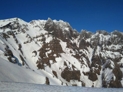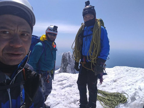 4P目は雪が少なく脆いので岩塔を登らず、右側をトラバースしてちょっとした岩で切る(55m)。少し足りないので20m伸ばして5Pで頂上直下の稜線に立つ。