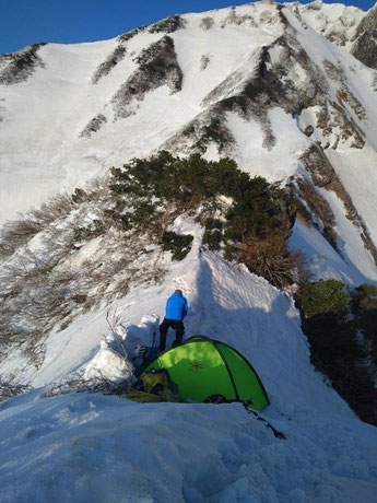 ちょっと細い稜線上だがテントは張る。雪が少ないのでテントの1/4が宙に浮くので雪を積んで整地をする。落ちたら400mくらい滑落だー!落ちたら痛いぞー!
