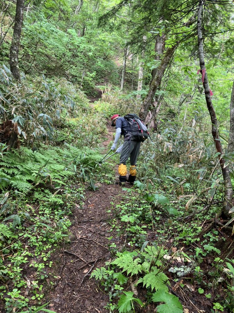 登山道はありますが、管理はそれほどではないため、笹や枝を切りながら登っていきます。