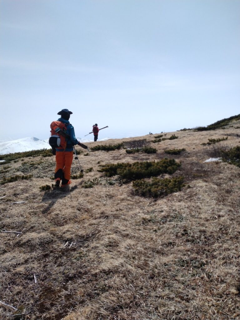 山頂近くの大斜面上部は雪がすっかり消えていて、スキーを持って雪があるところまで行きました。
