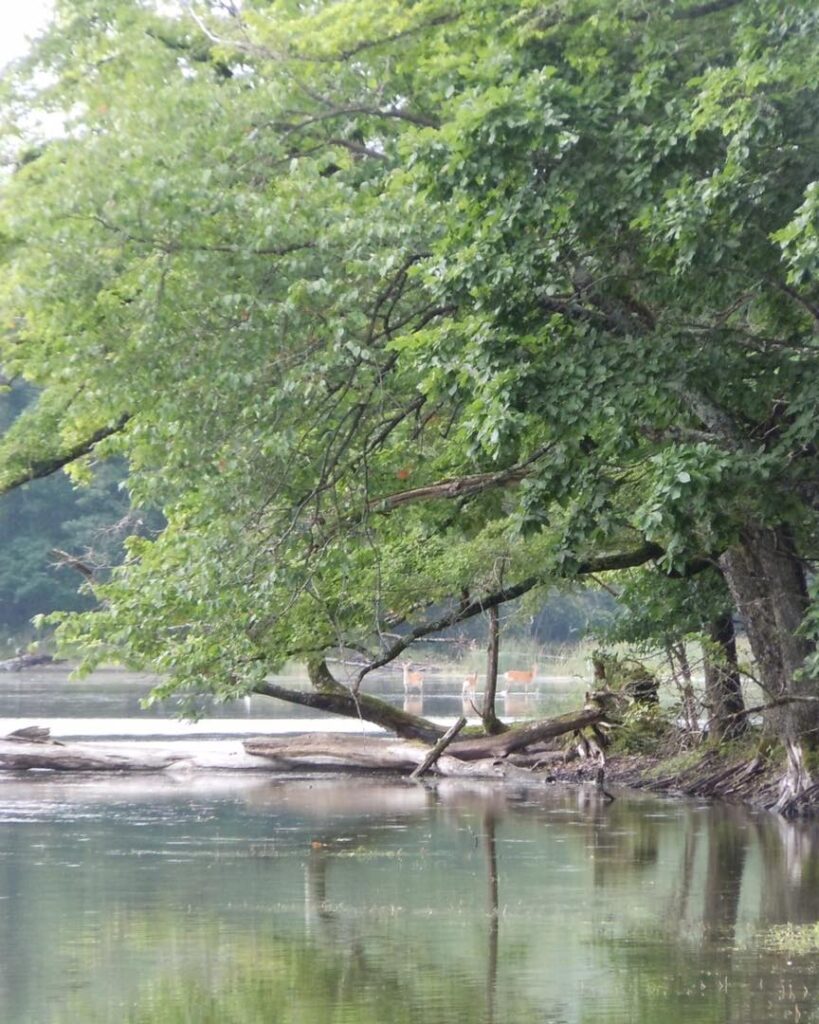 長い林道を歩き静かな湖畔に到着するとせり出した木の間遥か遠くに水浴びをする3頭の親子と思われる鹿を見つけた。思わずシャッターを切ったメンバーの写真…。