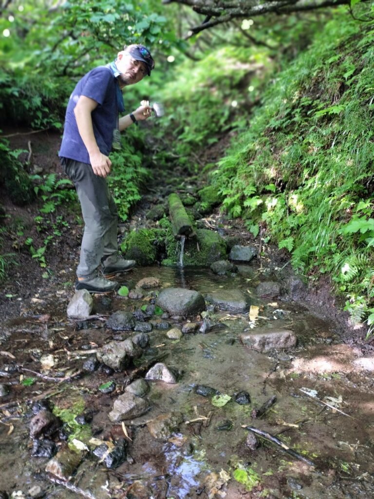 途中、弥三吉水で水を調達し、天気を期待しながら登りますが・・