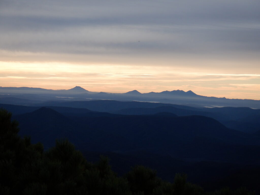 4時10分に駐車場スタート。曇りですが、風も弱く気温も丁度いい。東尾根コースの途中で、朝焼けの雄阿寒岳(左)、雌阿寒岳(右)も見ることができ感動。