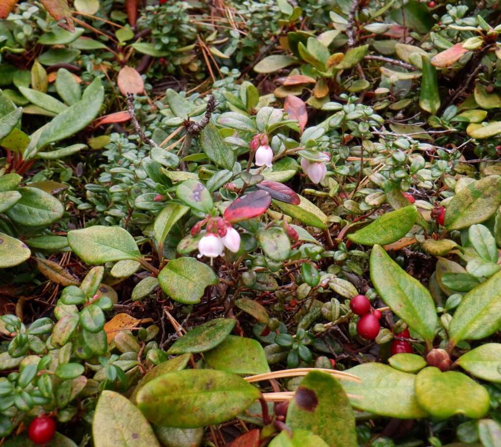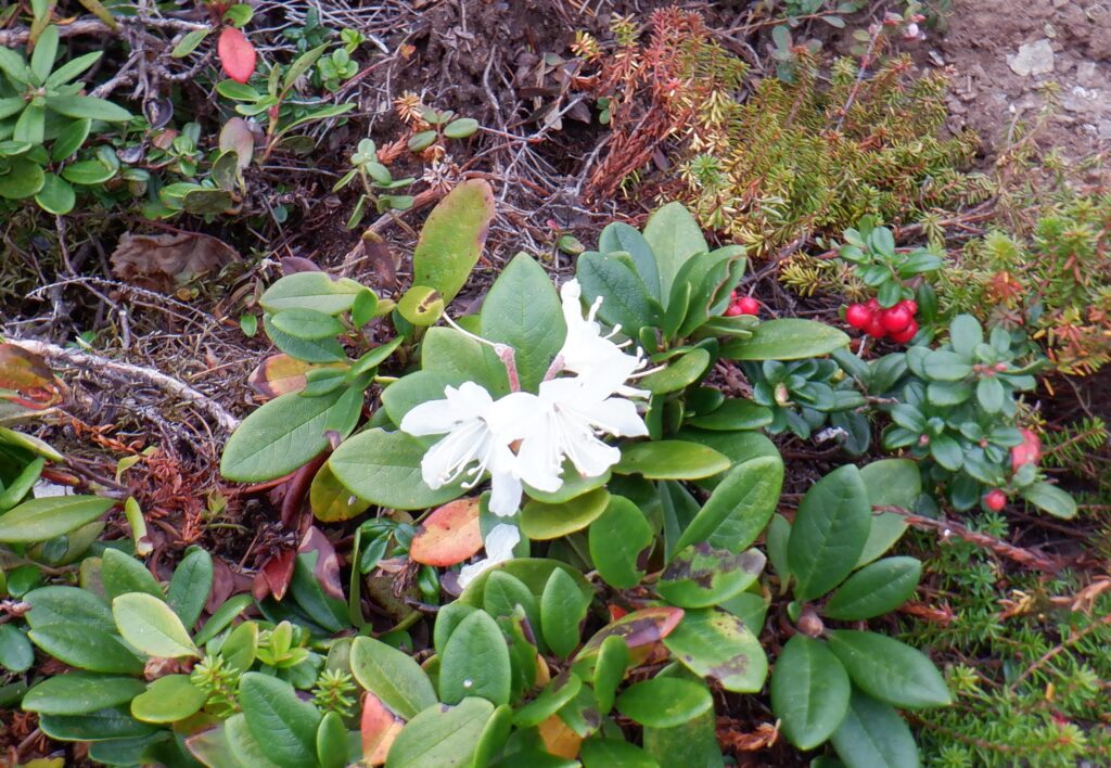 紅葉と共に、時季外れのキバナシャクナゲやコケモモの花も咲いていて、遅咲きの花見も楽しみました。