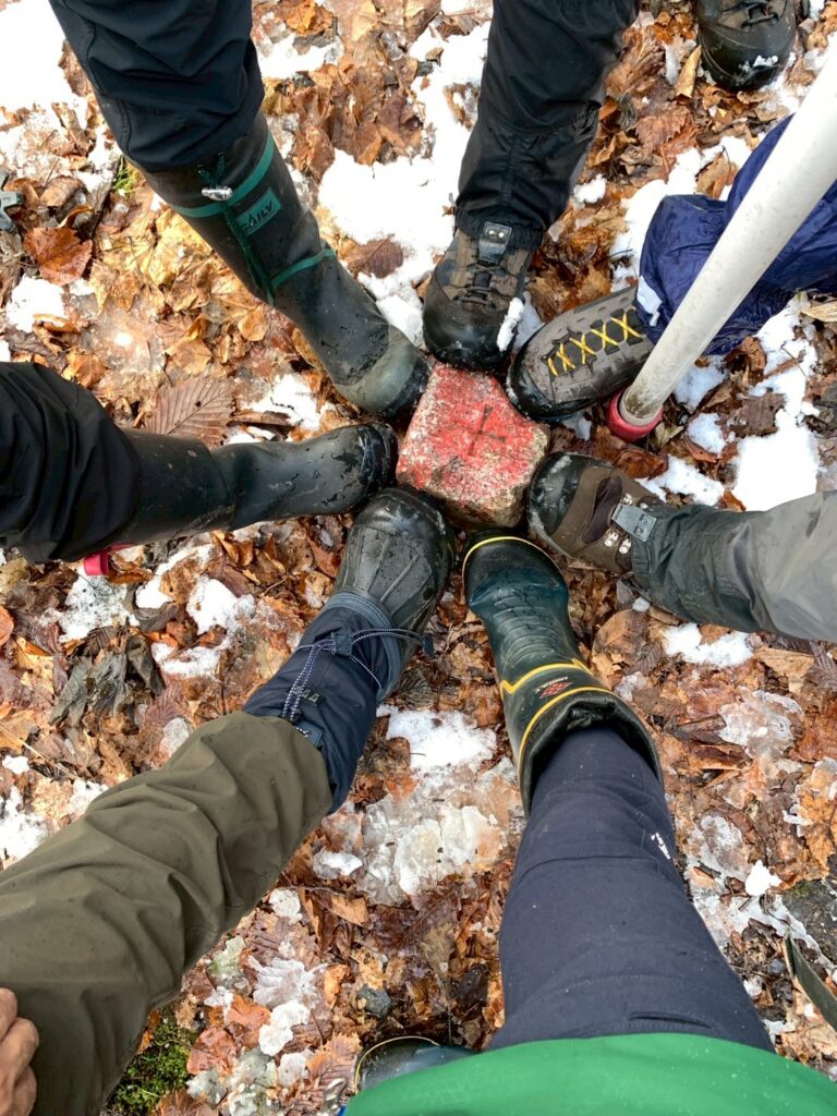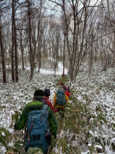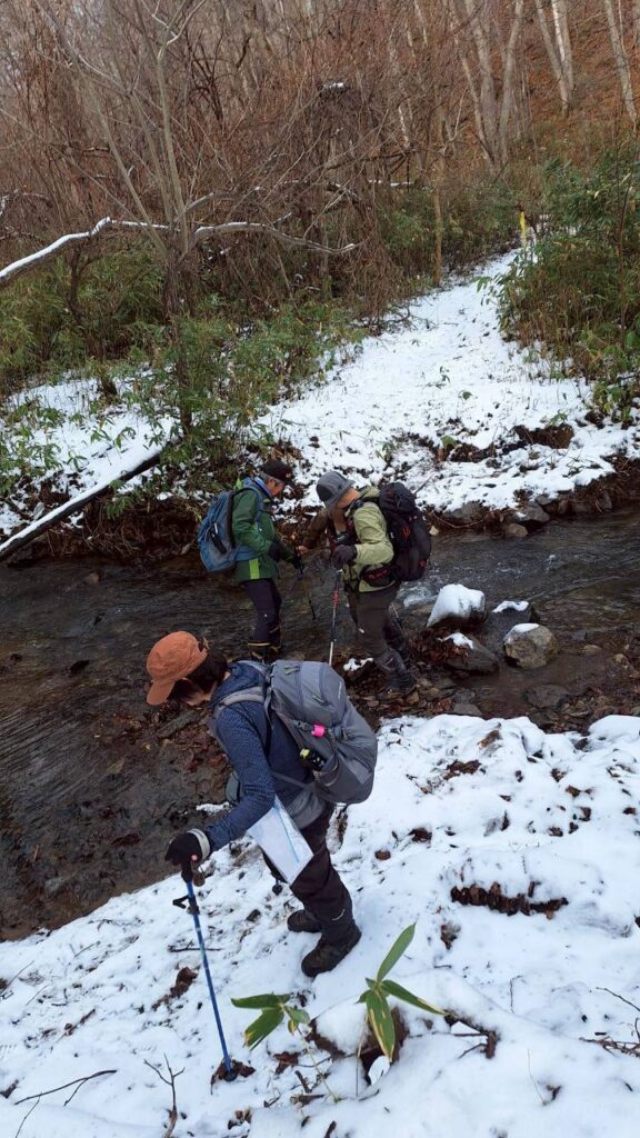 足回りはスパイク長靴3名、登山靴+ゲイター3名、防水シューズ1名。